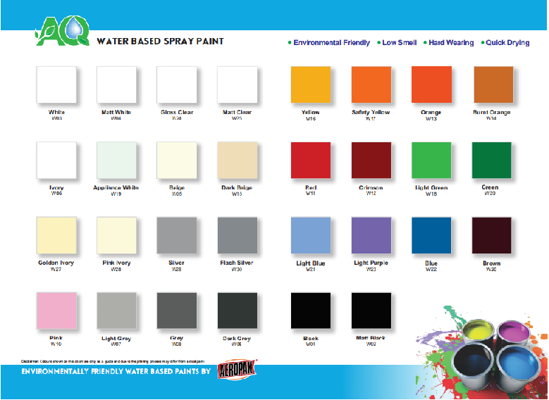 AEROPAK water based spray paint is environmentally friendly, quick drying paint.The main benefit of AEROPAK water based spray paints is that it product much less organic fumes (VOC's) than normal paints.The good news is that by using AEROPAK water based spray paints you can be clean up the air in your home and make a green change.